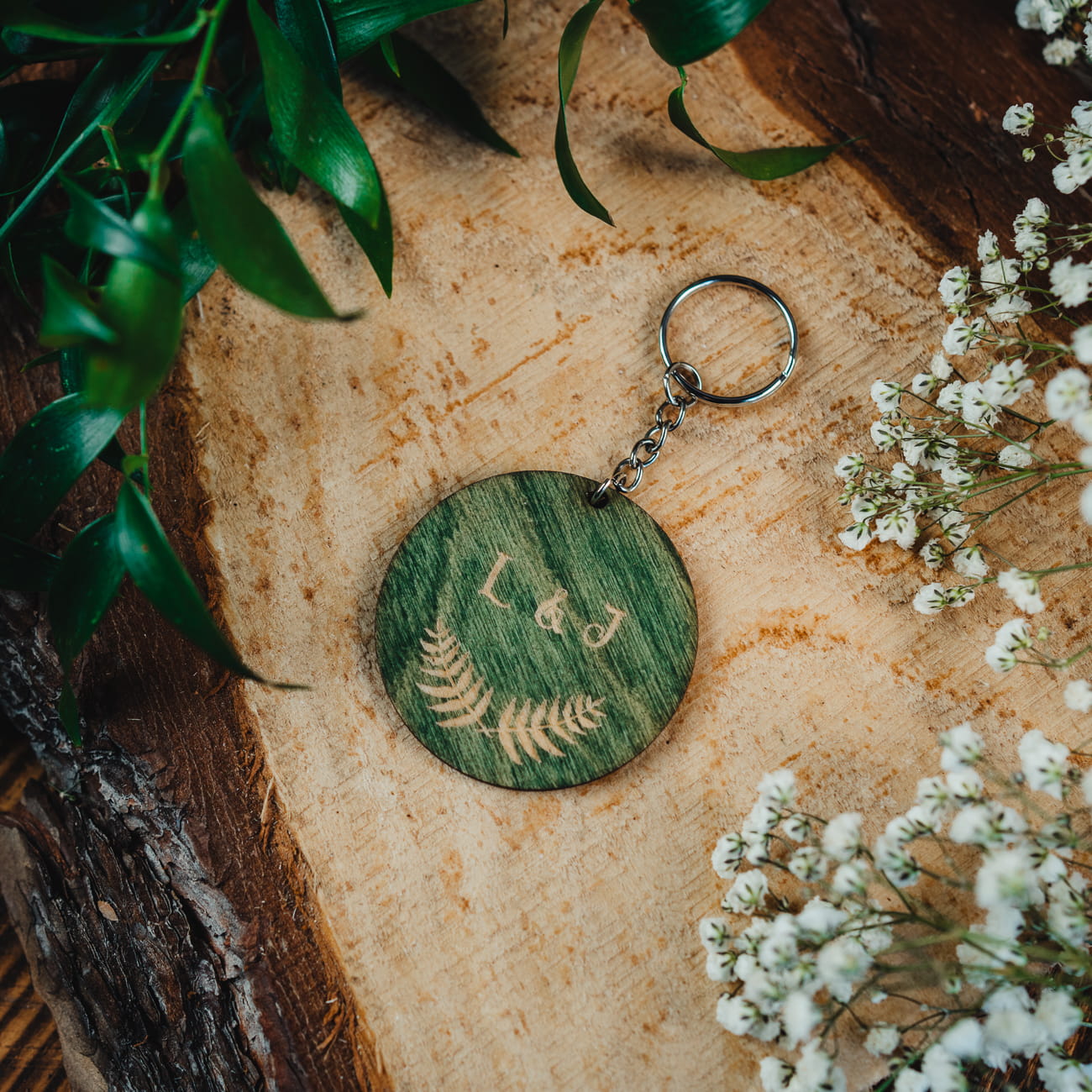 Ślub oraz przyjęcie weselne to jeden z najważniejszych dni w życiu. Drewniany brelok ślubny to cudowna niespodzianka aby podziękować wszystkim gościom, którzy towarzyszyli Nam w tak pięknym dniu. Pięknie też będzie zdobił stół podczas przyjęcia. Dekoracje wykonaliśmy w kształcie koła z wygrawerowanym napisem ze sklejki 3mm. Drewniany brelok pomalowaliśmy ręcznie oryginalnym olejem do drewna w kolorze zielonym. Drewniane podziękowania będą również świetną pamiątką na wiele lat, którą można przyczepić na lodówkę.