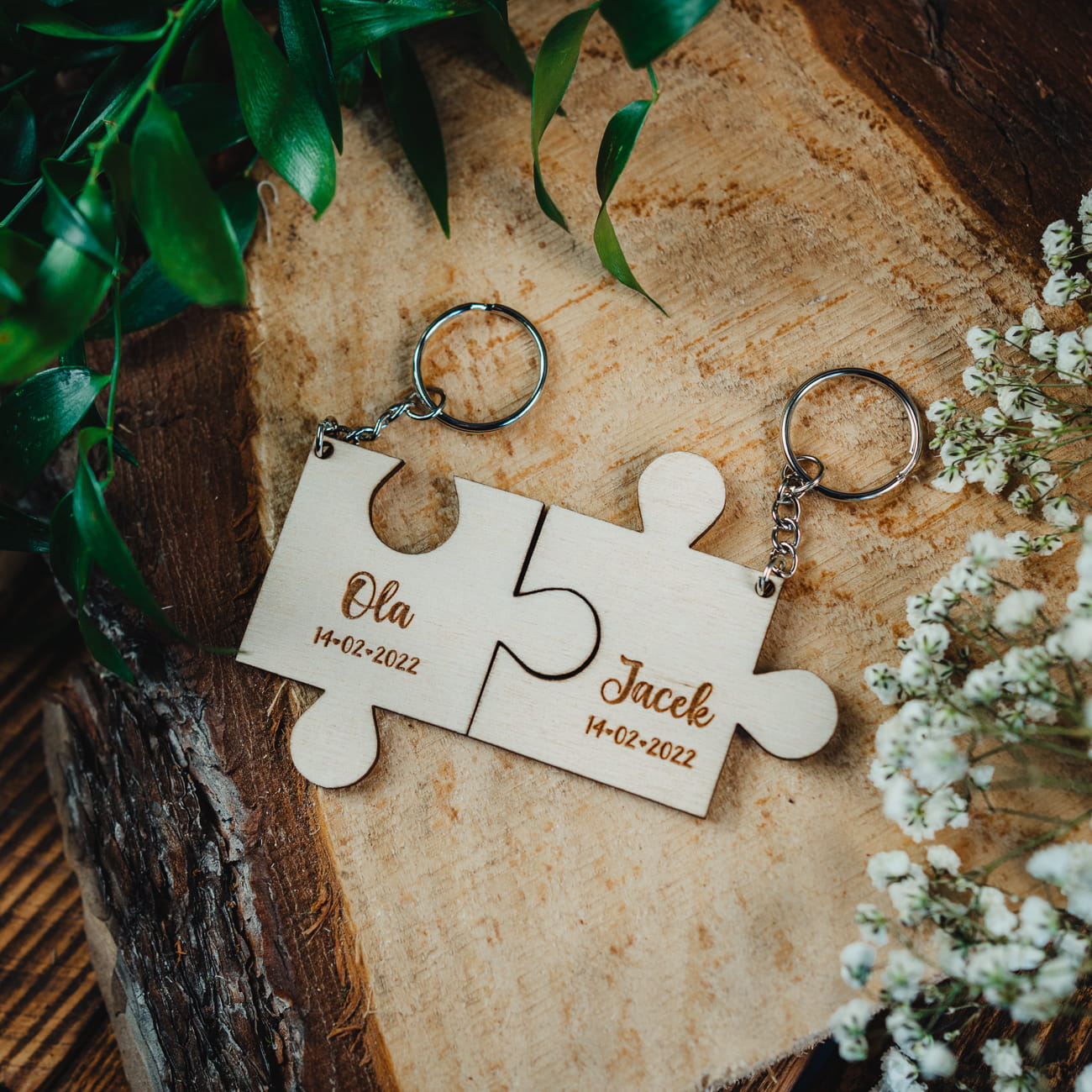 Walentynki czyli Dzień Zakochanych to jeden z najważniejszych dni w życiu. Drewniany brelok walentynkowy w nietypowym kształcie dwóch puzzli to cudowna niespodzianka dla obdarowanej osoby. Pięknie też będzie zdobił każdy miejsce w którym się znajdzie. Dekoracje wykonaliśmy w kształcie puzzli z wygrawerowanym napisem ze sklejki 3mm. Drewniany brelok pomalowaliśmy ręcznie oryginalnym olejem do drewna w kolorze naturalnym sosna. Drewniany brelok będzie również świetną pamiątką na wiele lat, którą można przyczepić na lodówkę.