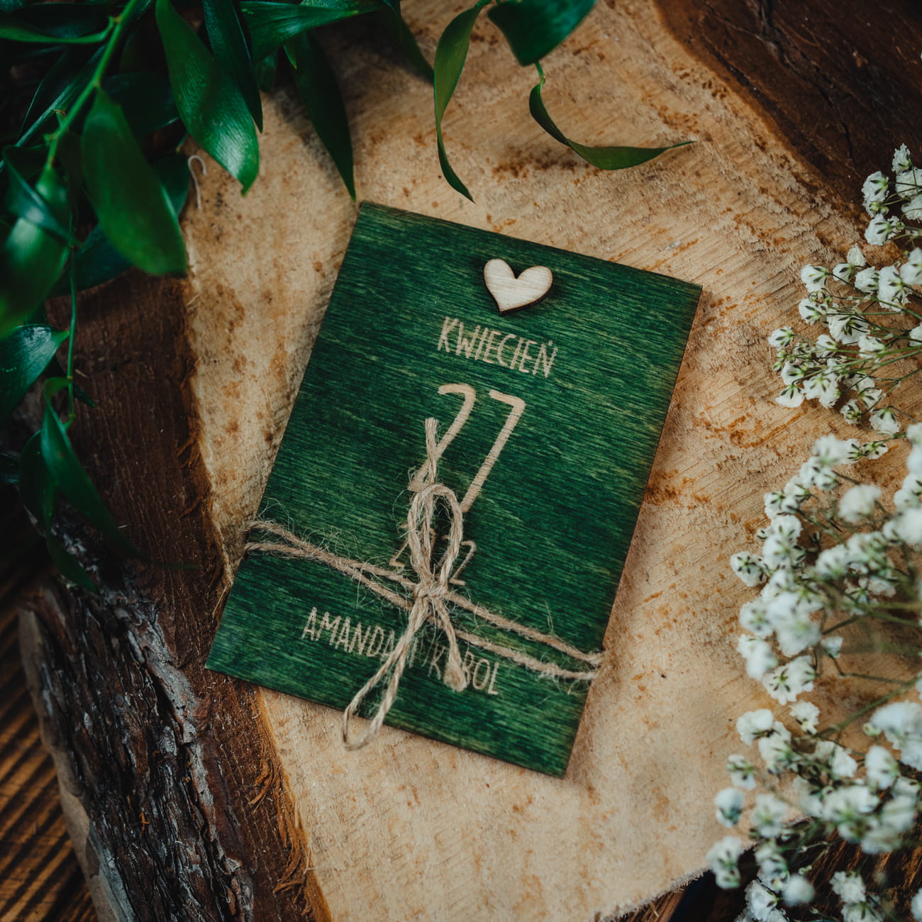 Ślub oraz przyjęcie weselne to jeden z najważniejszych dni w życiu. Drewniana kartka z kalendarza to cudowna niespodzianka aby podziękować wszystkim gościom, którzy towarzyszyli Nam w tak pięknym dniu. Pięknie też będzie zdobiła stół podczas przyjęcia. Dekoracje wykonaliśmy w kształcie prostokąt z wygrawerowanym napisem ze sklejki 3mm oraz naklejanym serduszkiem drewnianym. Drewnianą kartkę z kalendarza pomalowaliśmy ręcznie oryginalnym olejem do drewna w kolorze zielonym. Drewniane podziękowania będą również świetną pamiątką na wiele lat. Do drewnianego podziękowania dla gości przywiązany jest sznureczek jutowy dodając dekoracji jeszcze bardziej rustykalności.