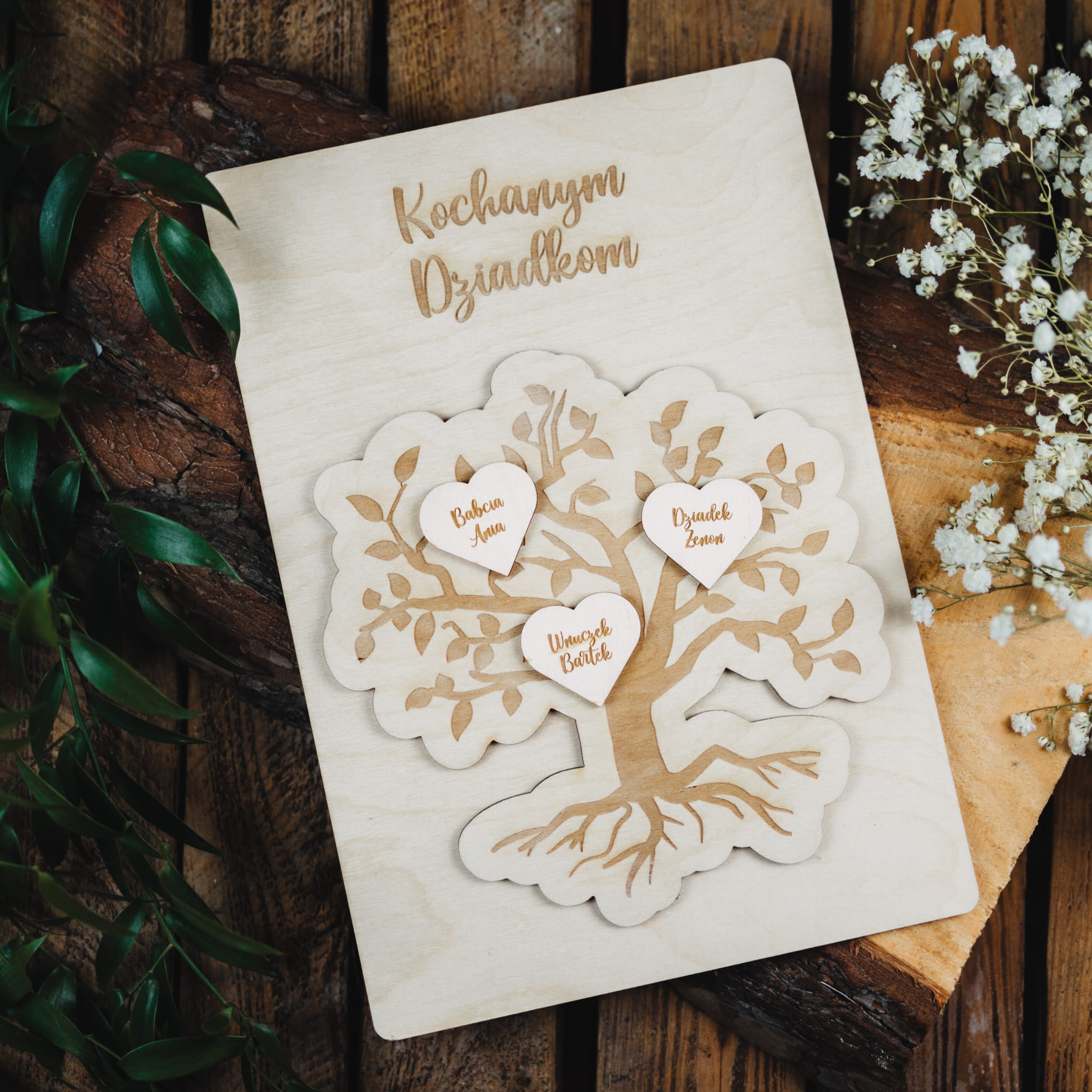 Drewniany plakat drzewo genealogiczne będzie piękna pamiątką na długie lata.