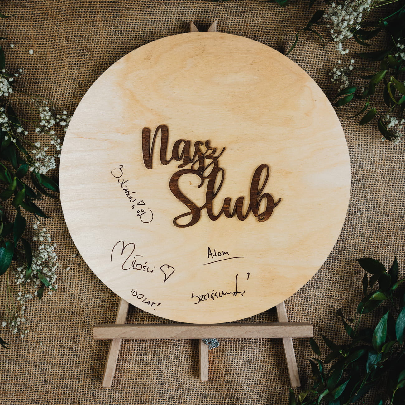 Księga Gości Rustykalna w formie koła to piękny detal, którego nie może zabraknąć na żadnym weselu. Księga Gości Rustykalna wypełniona indywidualnymi wpisami od gości weselnych stworzy wspaniałą pamiątkę na długie lata. Nasza Księga Gości Rustykalna w formie koła jest wykonana ze sklejki naturalnej 5 mm i drewnianej sztalugi. Rustykalna Księga Gości w formie koła pomalowana jest ręcznie oryginalnym olejem do drewna w kolorze naturalnym sosna. Ta rustykalna dekoracja doda wspaniałego i oryginalnego klimatu każdemu weselu. Księga Gości Rustykalna w formie koła świetnie nadaje się w formie obrazu na ścianę. Kolor i faktura drewna może różnić się lekko od tego co widzimy na zdjęciach. W zestawie drewniana sztaluga o wysokości 50 cm.