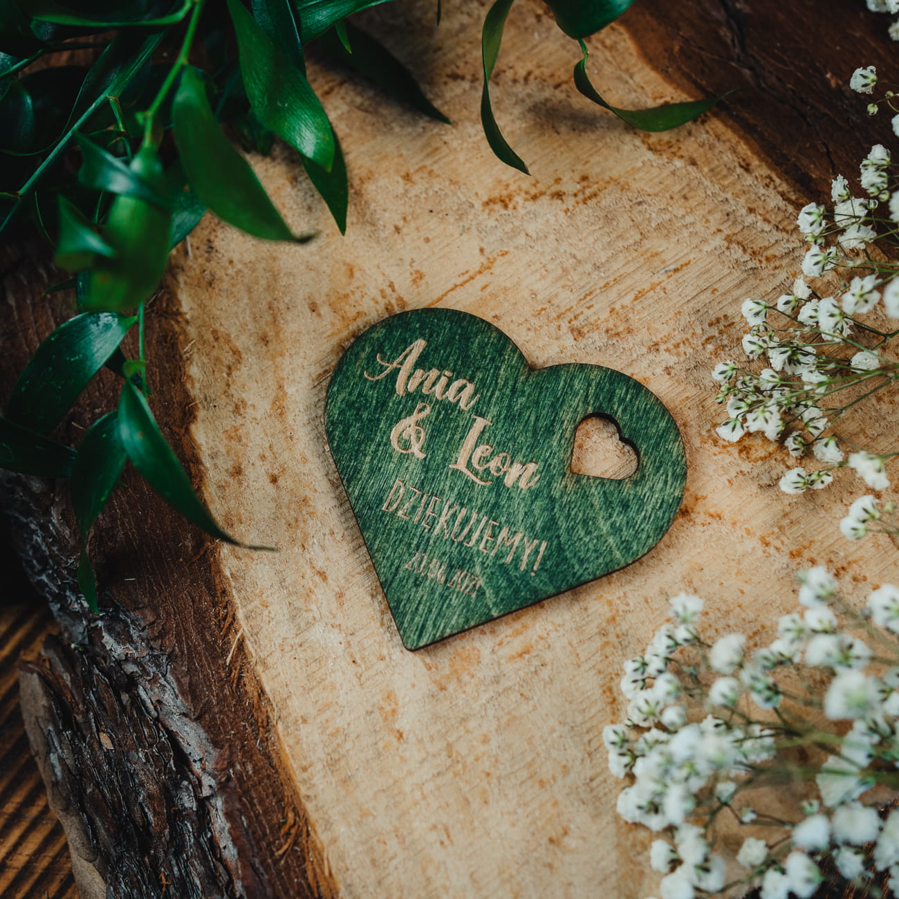Ślub oraz przyjęcie weselne to jeden z najważniejszych dni w życiu. Drewniany magnes ślubny to cudowna niespodzianka aby podziękować wszystkim gościom, którzy towarzyszyli Nam w tak pięknym dniu. Pięknie też będzie zdobił stół podczas przyjęcia.Dekoracje wykonaliśmy w kształcie serca z wygrawerowanym napisem ze sklejki 3mm. Drewniany magnes pomalowaliśmy ręcznie. oryginalnym olejem do drewna w kolorze zielonym. Drewniane podziękowania będą również świetną pamiątką na wiele lat, którą można przyczepić na lodówkę.