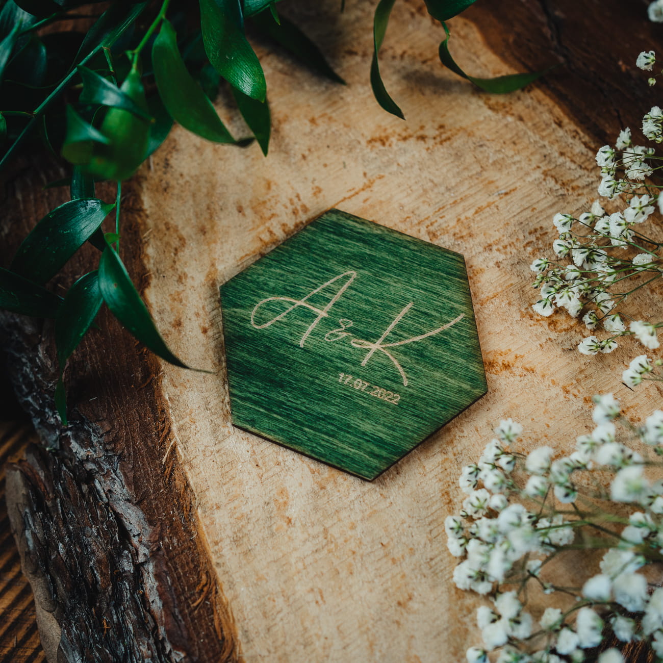 Ślub oraz przyjęcie weselne to jeden z najważniejszych dni w życiu. Drewniany magnes ślubny to cudowna niespodzianka aby podziękować wszystkim gościom, którzy towarzyszyli Nam w tak pięknym dniu. Pięknie też będzie zdobił stół podczas przyjęcia.Dekoracje wykonaliśmy w kształcie sześciokątu z wygrawerowanym napisem ze sklejki 3mm. Drewniany magnes pomalowaliśmy ręcznie oryginalnym olejem do drewna w kolorze zielony. Drewniane podziękowania będą również świetną pamiątką na wiele lat, którą można przyczepić na lodówkę.