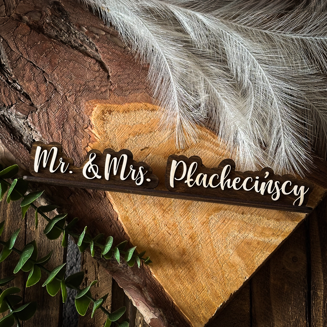 Drewniany rustykalny napis na stół Pary Młodej to wyjątkowa dekoracja, która podkreśli najważniejsze miejsce podczas przyjęcia weselnego. Stylowy napis doskonale prezentuje się na stole prezydialnym, dodając elegancji i indywidualnego charakteru całej aranżacji.Dekoracja wykonana jest z dbałością o detale i osadzona na stabilnej podstawie, dzięki czemu można ją łatwo ustawić na stole Pary Młodej. Personalizacja w postaci nazwiska sprawia, że napis staje się nie tylko dekoracją weselną, ale również piękną pamiątką z dnia ślubu.Uniwersalny design sprawia, że napis idealnie pasuje do wesel w stylu rustykalnym, boho, klasycznym, oraz nowoczesnym. Świetnie komponuje się z dekoracjami kwiatowymi, świecami oraz naturalnymi elementami dekoracyjnymi.Może być wykorzystany nie tylko na stole Pary Młodej, ale także jako element dekoracji ścianki ślubnej, candy baru lub sesji zdjęciowej. Dekoracje wykonaliśmy ze sklejki z naklejanymi napisami oraz pomalowaliśmy w kolorze palisander.