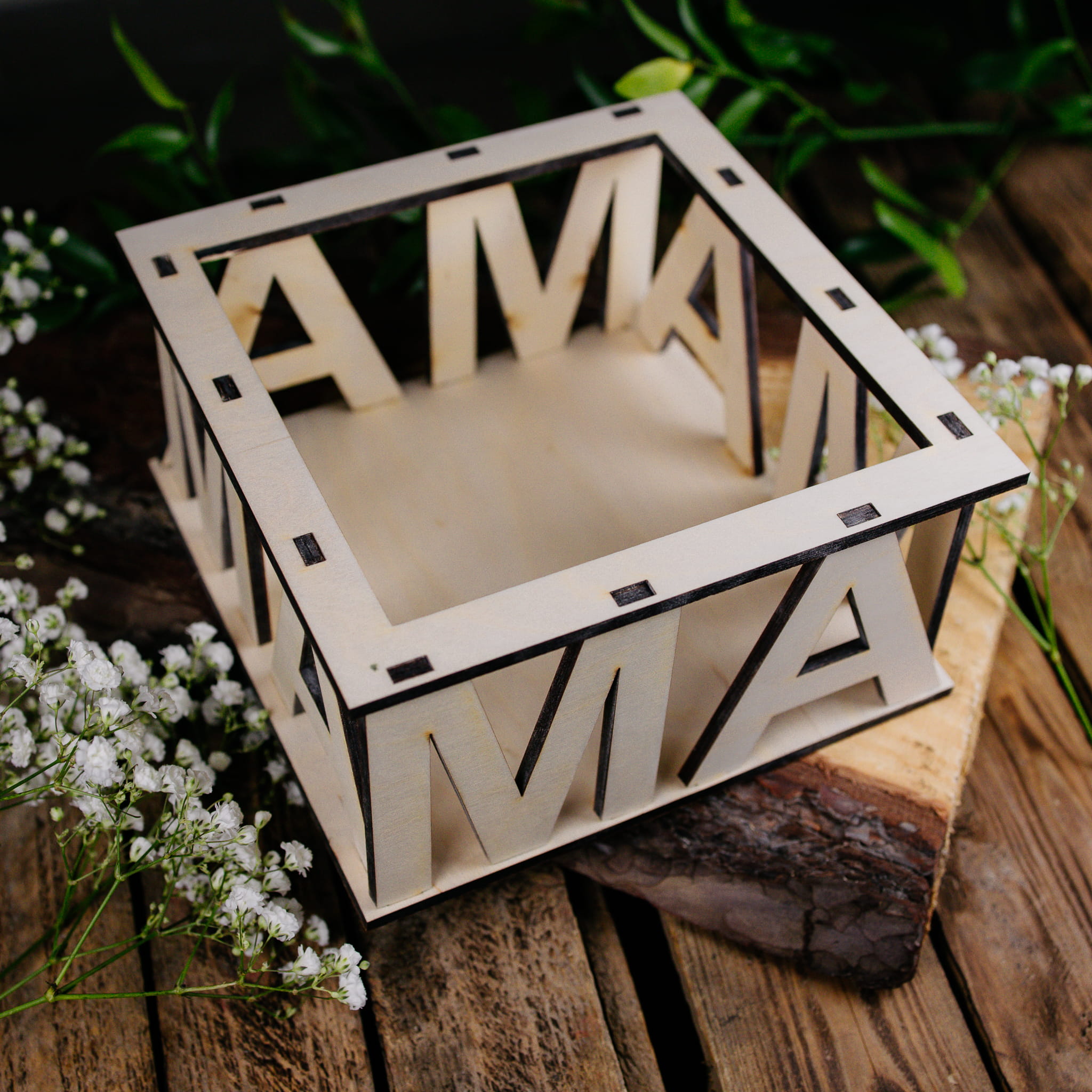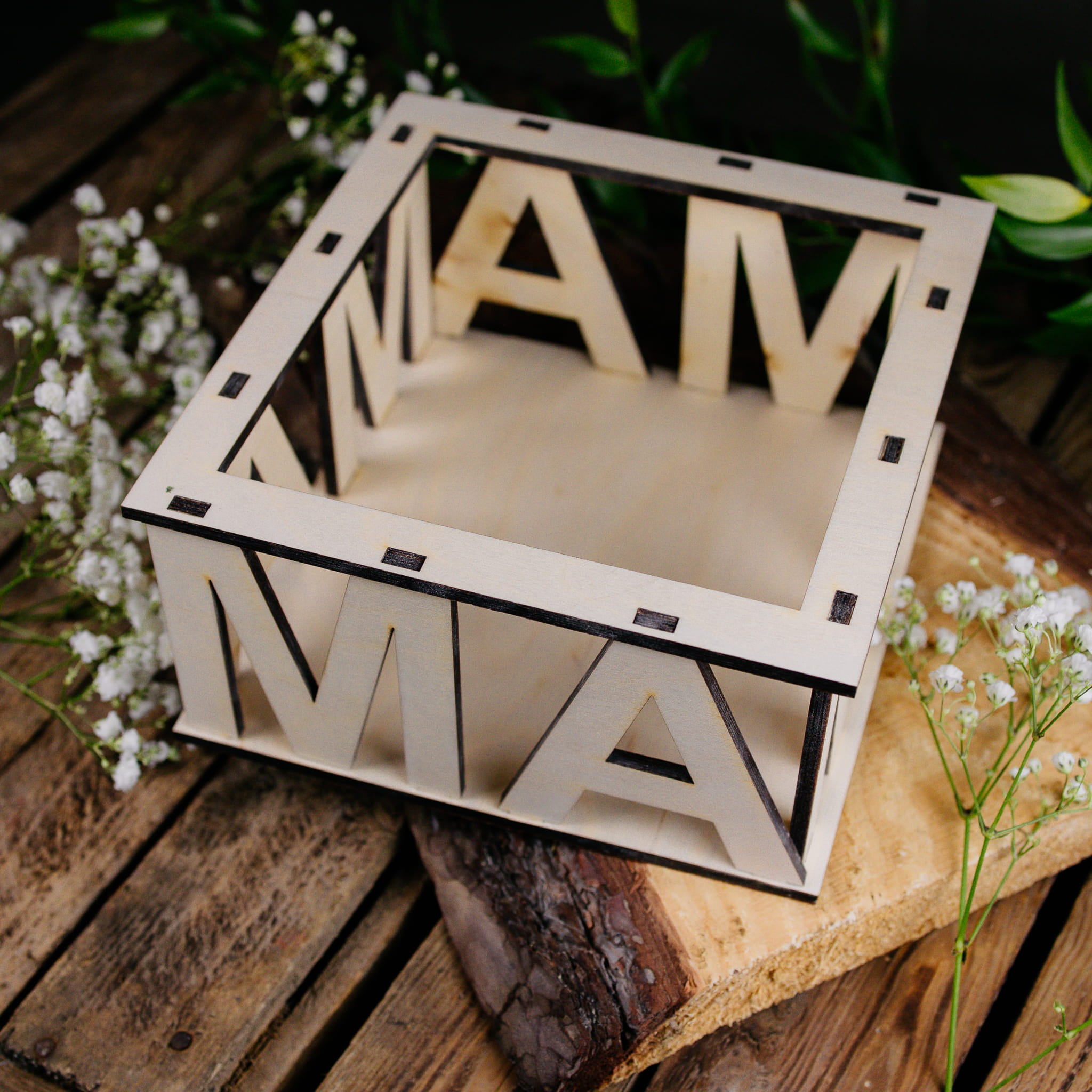 Drewniana osłonka na doniczkę to świetna dekoracja na Dzień Mamy. Drewniana dekoracja to fajna opcja aby jeszcze bardziej urozmaicić prezent dla Mamy. Dekoracja może służyć również jako box prezentowy, który można samodzielnie wypełnić. Nasza dekoracja na pewno zaskoczy ukochaną mamę. Osłonka w formie kwadratu z pięknym napisem MAMA będzie piękną pamiątką na długie lata. Drewniana osłonka na doniczkę na Dzień Mamy to wspaniały prezent w jej wyjątkowym dniu.