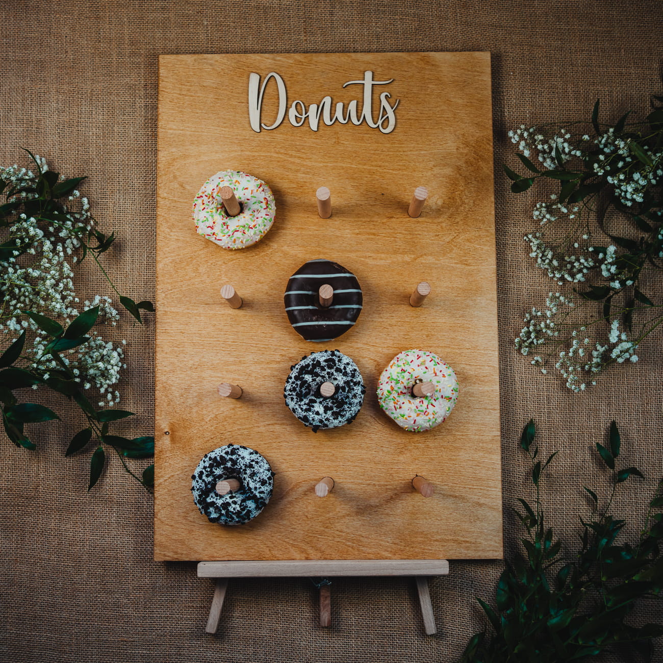 Rustykalna drewniana tablica na pączki Donaty to świetna opcja na słodki stół. Idealnie sprawdzi się na różnych imprezach. To idealny sposób na ekspozycję uwielbianych i odjazdowych pączków, co z pewnością zwróci uwagę gości imprezy.