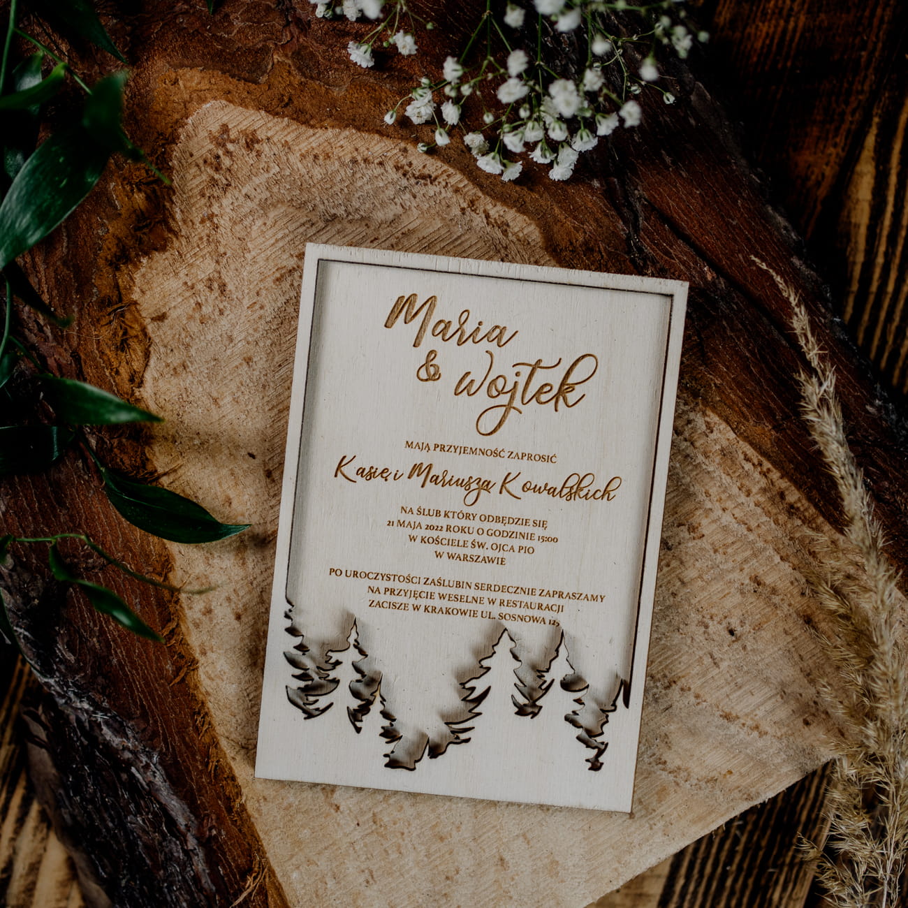 Drewniane personalizowane zaproszenia ślubne rustykalne wywołają zachwyt na twarzach przyszłych gości. Drewniane dekoracje wykonaliśmy z drewna, z piękną grafiką wypalaną laserem.