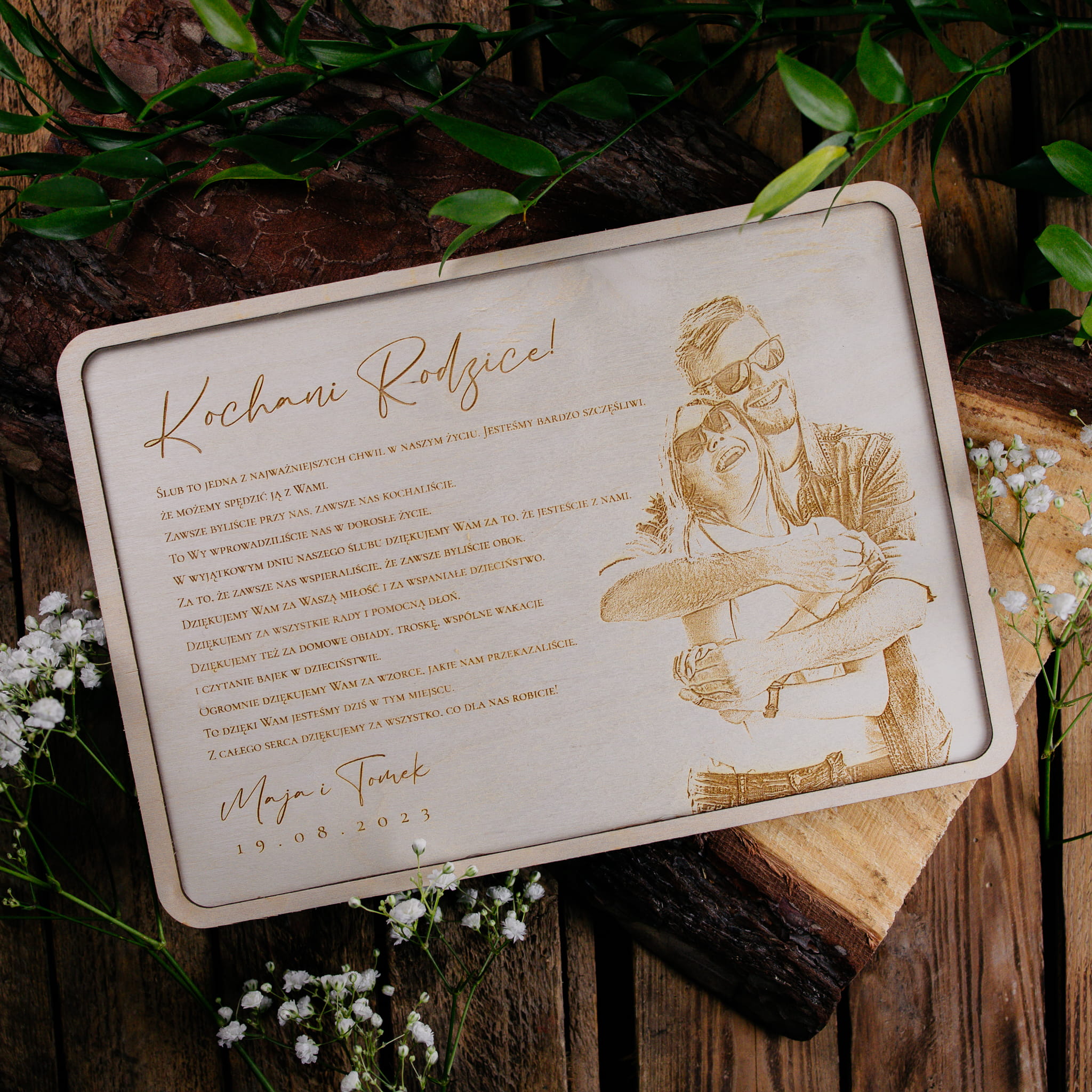 Drewniana tabliczka ze zdjęciem Młodej Pary oraz pięknym grawerowanym tekstem to przepiękna niespodzianka jako podziękowanie dla Rodziców. Spersonalizowane zdjęcie oraz tekst zamknięte w drewnianej ramce świetnie sprawdzi się jako podziękowanie dla Rodziców podczas uroczystości ślubu, jak również będzie piękną pamiątką na długie lata. Drewniana tabliczka idealnie wpasuje się w klimat rustykalny, boho oraz minimalistyczny. Prezent dla Rodziców jako podziękowanie za trud oraz wychowanie to najpiękniejsza rzecz jaką Rodzice mogą dostać w dniu ślubu swoich dzieci. Drewniana tabliczka została wykonana z naturalnej sklejki o grubości 3 mm.