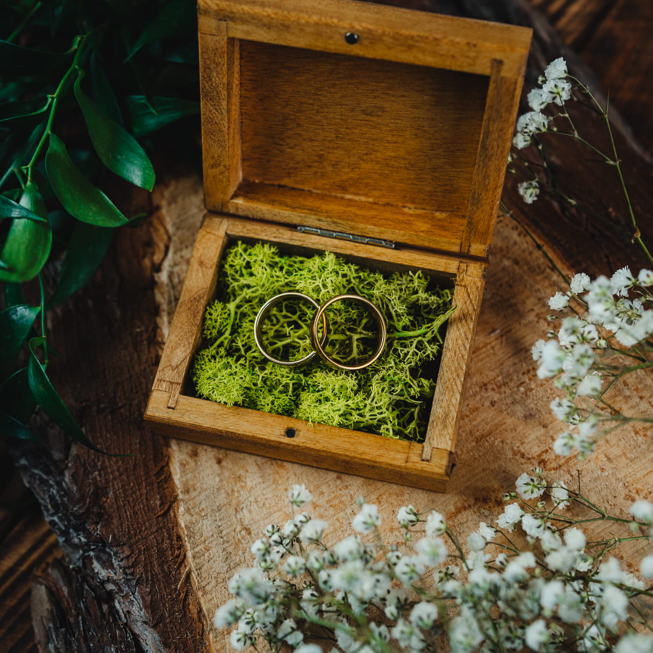 Drewniane pudełka na obrączki będą świetnie wyglądać podczas przygotowań, oraz zrobią duże wrażenie na gościach. Równie pięknie będą prezentować się na fotografiach oraz sesjach zdjęciowych. Nasze drewniane pudełka na obrączki wykonane są z sosny, oraz sklejki naturalnej. Drewniane pudełka na obrączki malujemy ręcznie oryginalnym olejem w kolorze dąb. Wnętrze drewnianego pudełka na obrączki wypełnione jest naturalnym mchem (chrobotek reniferowy), dzięki czemu drewniane pudełko prezentuje się niezwykle szykownie i elegancko. Kolor, faktura drewna i odcień mchu może różnić się lekko od tego co widzimy na zdjęciach.
