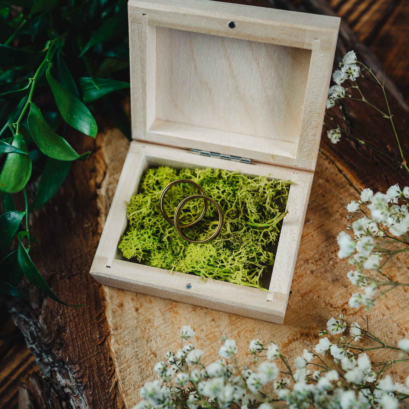 Drewniane pudełka na obrączki będą świetnie wyglądać podczas przygotowań, oraz zrobią duże wrażenie na gościach. Równie pięknie będą prezentować się na fotografiach oraz sesjach zdjęciowych. Nasze drewniane pudełka na obrączki wykonane są z sosny, oraz sklejki naturalnej. Drewniane pudełka na obrączki malujemy ręcznie oryginalnym olejem w kolorze naturalnym sosna. Wnętrze drewnianego pudełka na obrączki wypełnione jest naturalnym mchem (chrobotek reniferowy), dzięki czemu drewniane pudełko prezentuje się niezwykle szykownie i elegancko. Kolor, faktura drewna i odcień mchu może różnić się lekko od tego co widzimy na zdjęciach.
