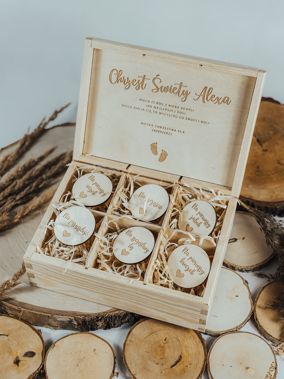 Wyjątkowe, drewniane pudełko w formie skrzynki to cudowna i oryginalna pamiątka na długie lata. Drewniane pudełko na Chrzest Święty malujemy ręcznie oryginalnym olejem do drewna w kolorze naturalnym sona. Naszą dekoracje zdobimy pięknymi wygrawerowanymi życzeniami oraz delikatnym wzorem dziecięcych stópek. Nasze drewniane pudełko na Chrzest to przepiękny, starannie wykonany zamiennik papierowej koperty czy innego prezentu Kolor i faktura drewna może się lekko różnić od tego co widzimy na zdjęciach. W pudełko umieściliśmy 6 drewnianych tabliczek sugerujących jakie dodatki należy włożyć do skrzynki.