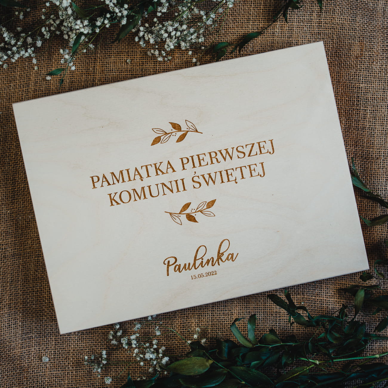 Drewniane pudełko na Pierwszą Komunię Świętą