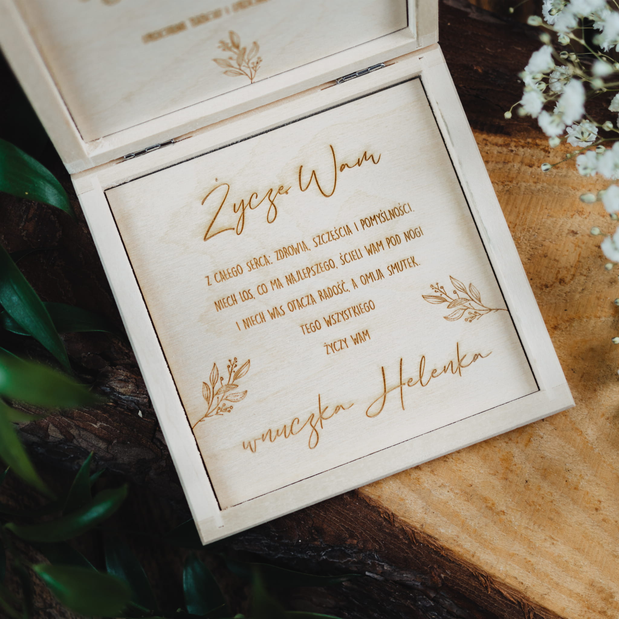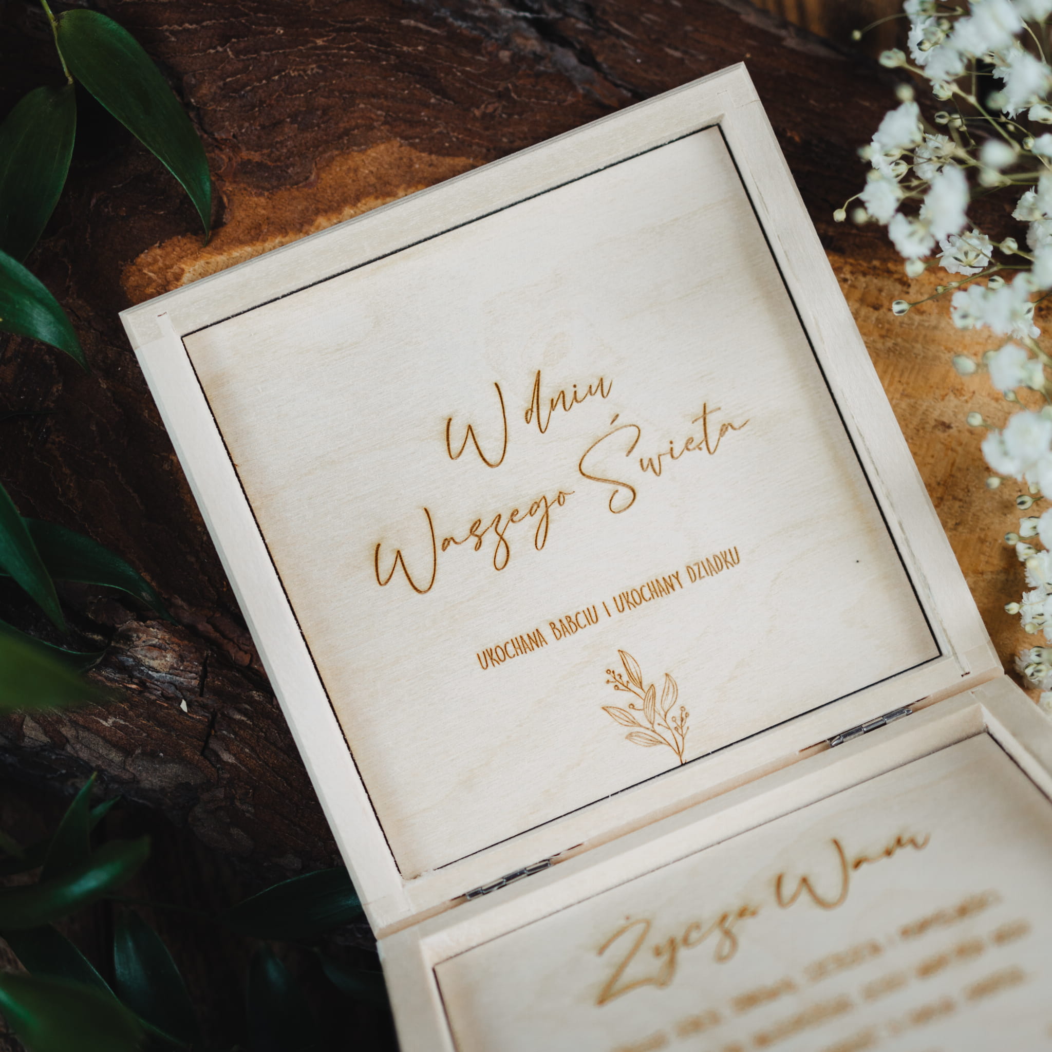 Drewniane personalizowane pudełeczko z życzeniami wywoła zachwyt na twarzach Dziadków.