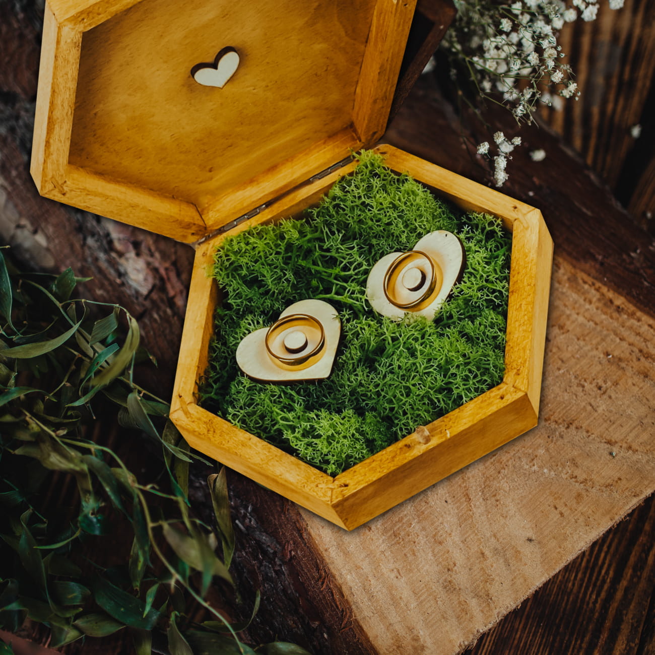 Drewniane szkatułki na obrączki będą świetnie wyglądać podczas przygotowań, oraz zrobią duże wrażenie na gościach. Równie pięknie będą prezentować się na fotografiach oraz sesjach zdjęciowych. Nasze drewniane szkatułki na obrączki wykonane są z sosny, oraz sklejki naturalnej. Drewniane szkatułki na obrączki malujemy ręcznie oryginalnym olejem w kolorze dąb. Wnętrze drewnianej szkatułki na obrączki wypełnione jest naturalnym mchem (chrobotek reniferowy), dzięki czemu drewniane szkatułki prezentują się niezwykle szykownie i elegancko. Kolor, faktura drewna i odcień mchu może różnić się lekko od tego co widzimy na zdjęciach. Kolor, faktura drewna i odcień mchu może różnić się lekko od tego co widzimy na zdjęciach.
