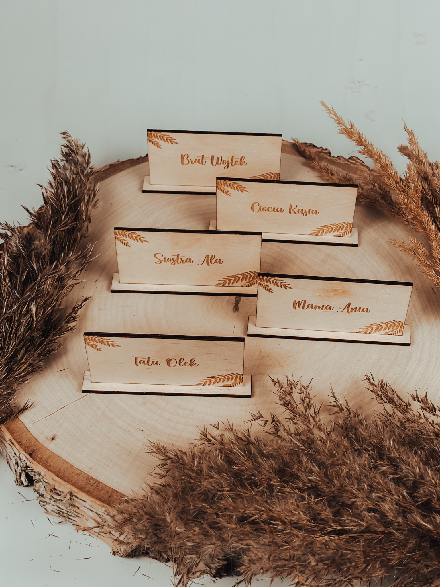 Piękne drewniane winietki z podstawką z drewna brzozy na stół weselny bedą pięknie zachwycały swoją oryginalnością. Idealnie nadadzą się jako dodatek do wesel rustykalnych oraz w stylu boho.