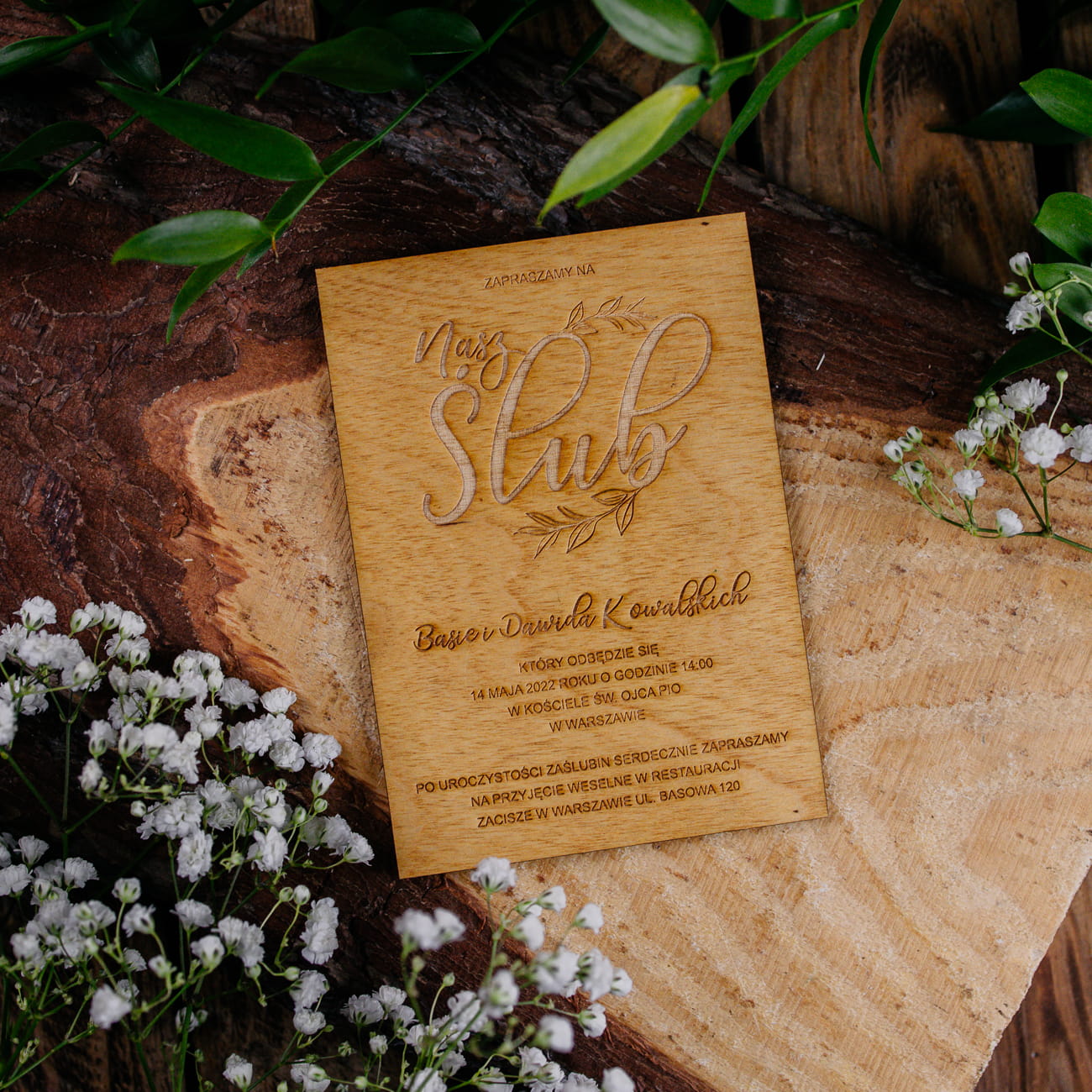 Drewniane personalizowane zaproszenia ślubne rustykalne wywołają zachwyt na twarzach przyszłych gości. Drewniane dekoracje wykonaliśmy z drewna, z piękną grafiką wypalaną laserem.