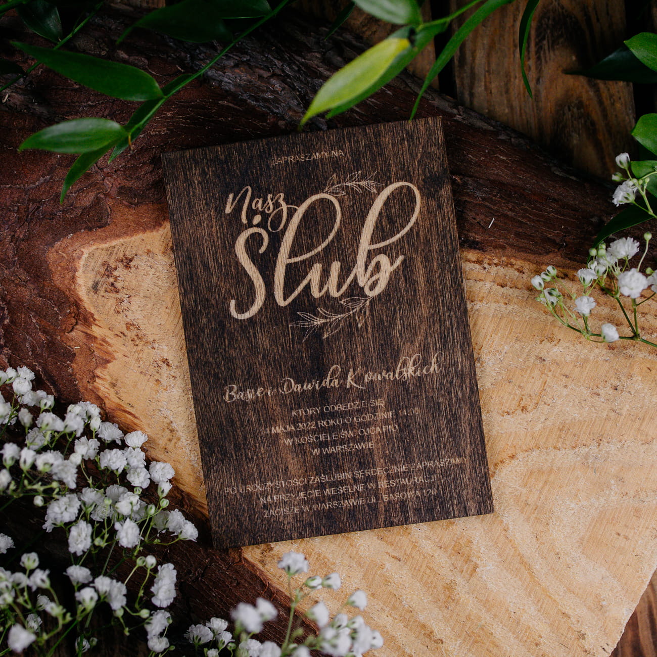 Drewniane personalizowane zaproszenia ślubne rustykalne wywołają zachwyt na twarzach przyszłych gości. Drewniane dekoracje wykonaliśmy z drewna, z piękną grafiką wypalaną laserem.