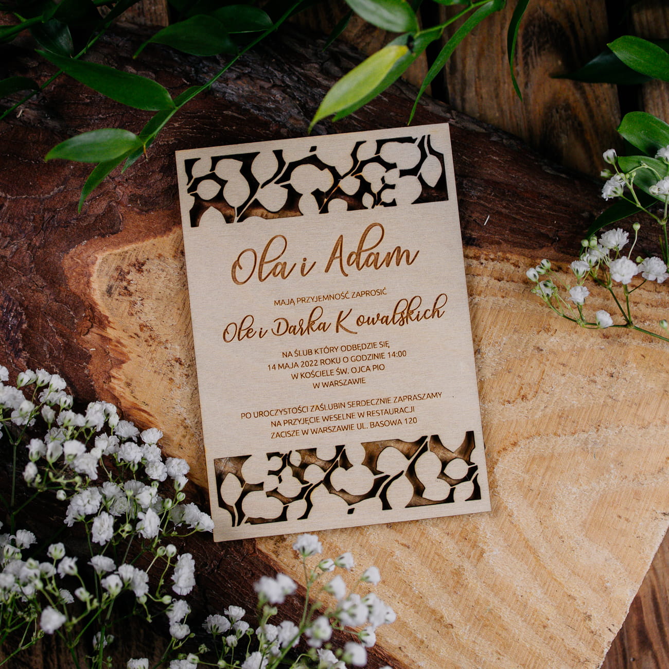 Drewniane personalizowane zaproszenia ślubne rustykalne wywołają zachwyt na twarzach przyszłych gości. Drewniane dekoracje wykonaliśmy z drewna, z piękną grafiką wypalaną laserem.