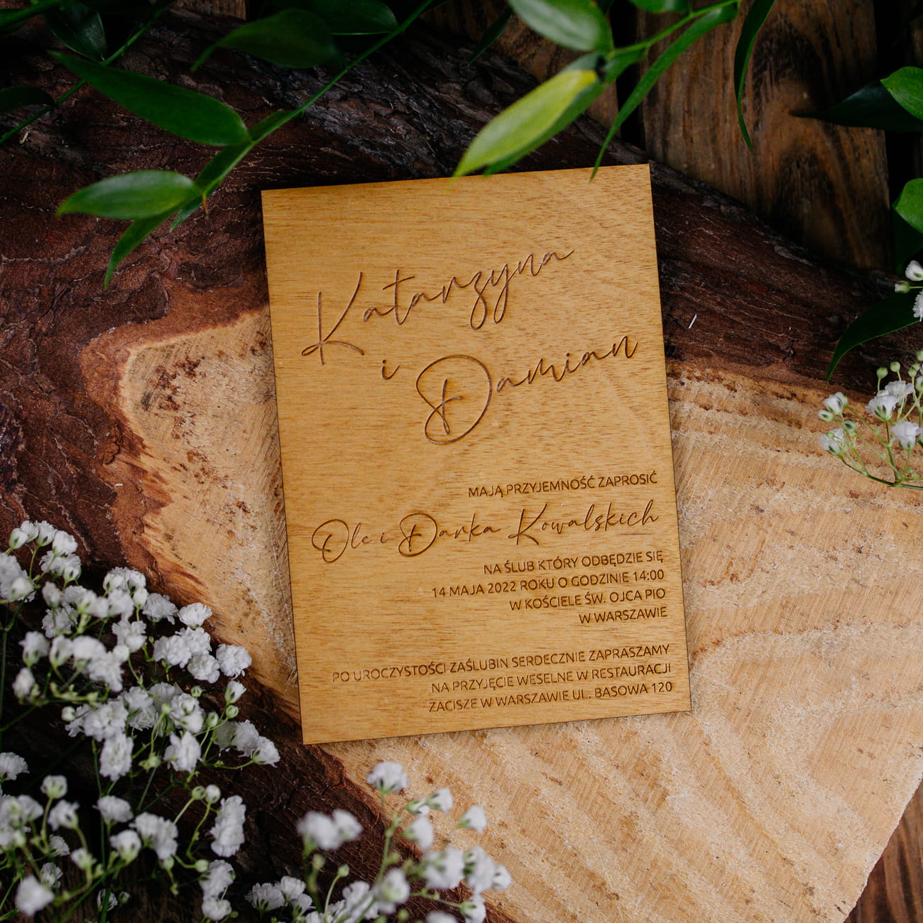 Drewniane personalizowane zaproszenia ślubne rustykalne wywołają zachwyt na twarzach przyszłych gości. Drewniane dekoracje wykonaliśmy z drewna, z piękną grafiką wypalaną laserem. Drewniane zaproszenia rustykalne są jedyne w swoim rodzaju. Drewniane zaproszenia są w pełni personalizowane.