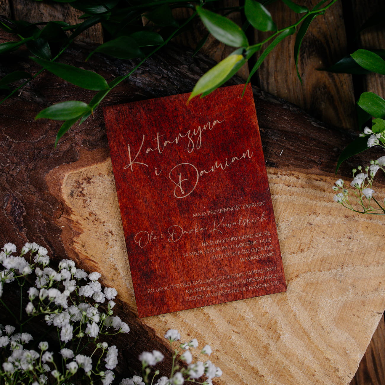 Drewniane personalizowane zaproszenia ślubne rustykalne wywołają zachwyt na twarzach przyszłych gości. Drewniane dekoracje wykonaliśmy z drewna, z piękną grafiką wypalaną laserem.
