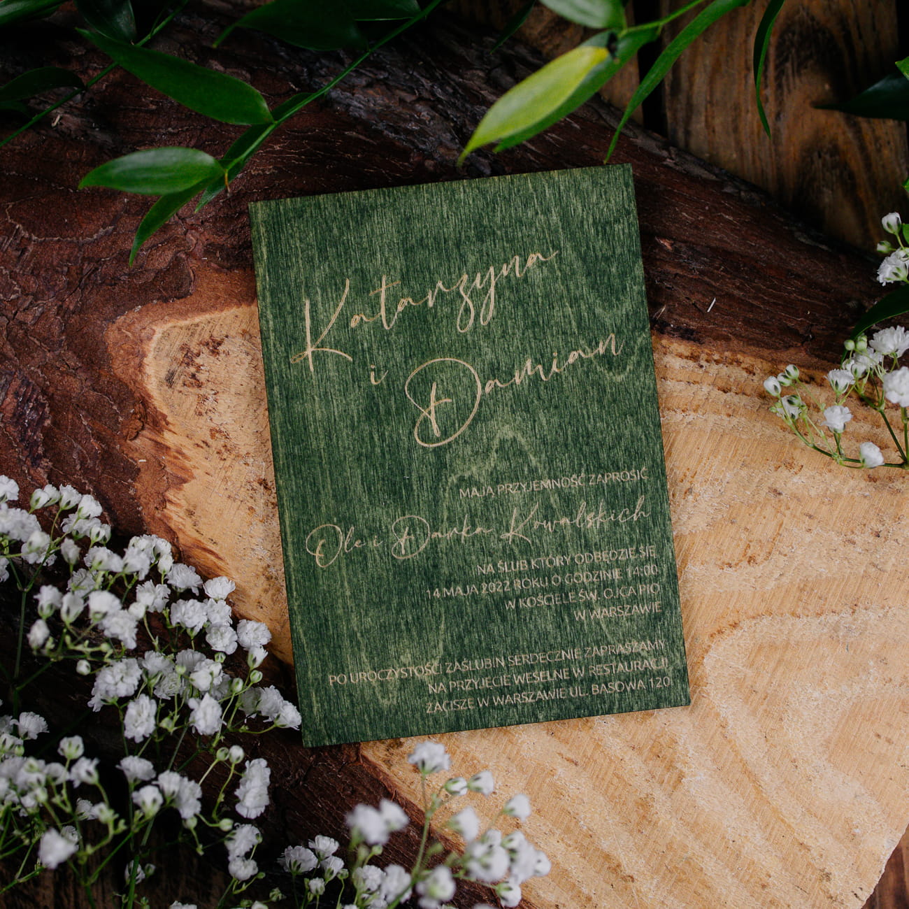 Drewniane personalizowane zaproszenia ślubne rustykalne wywołają zachwyt na twarzach przyszłych gości. Drewniane dekoracje wykonaliśmy z drewna, z piękną grafiką wypalaną laserem. Drewniane zaproszenia rustykalne są jedyne w swoim rodzaju. Drewniane zaproszenia są w pełni personalizowane. Jeśli planujesz ślub w stylu rustykalnym bądź boho to idealnie bedą pasować.Nasz produkt jest wykonany z naturalnej sklejki. Drewniane zaproszenia ślubne malujemy ręcznie oryginalnym olejem do drewna w kolorze zielonym. Kolor i faktura drewna może różnić się lekko od tego co widzimy na zdjęciach.