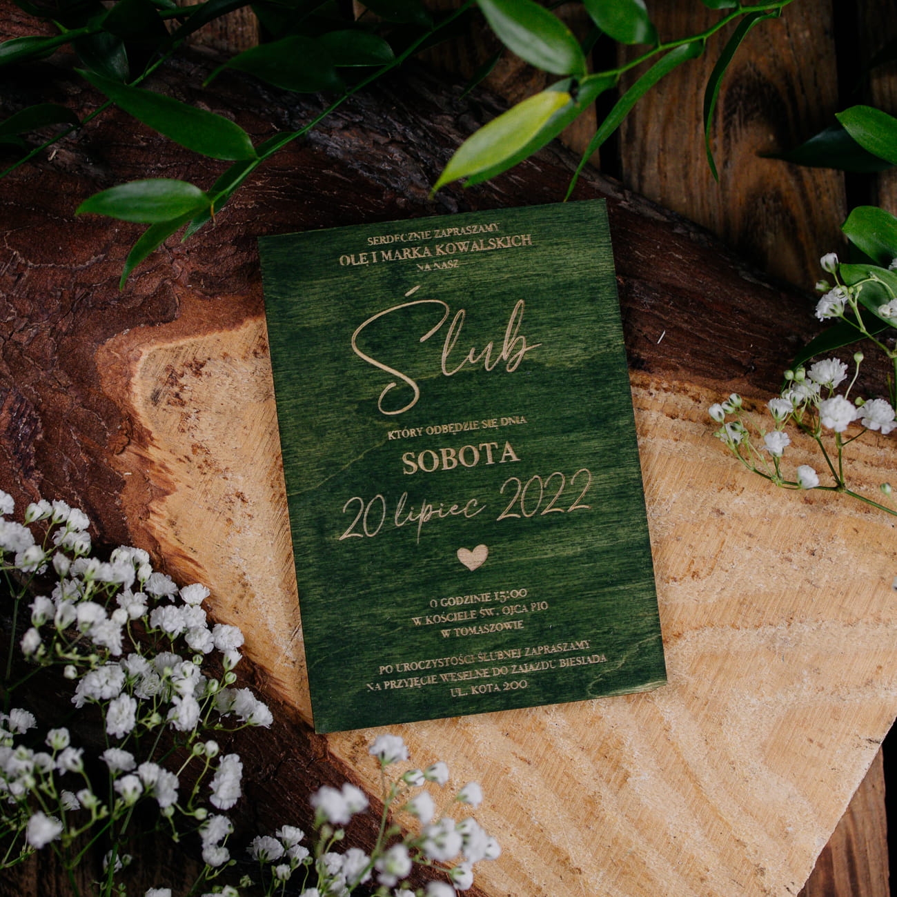 Drewniane personalizowane zaproszenia ślubne rustykalne wywołają zachwyt na twarzach przyszłych gości. Drewniane dekoracje wykonaliśmy z drewna, z piękną grafiką wypalaną laserem. Drewniane zaproszenia rustykalne są jedyne w swoim rodzaju. Drewniane zaproszenia są w pełni personalizowane. Jeśli planujesz ślub w stylu rustykalnym bądź boho to idealnie bedą pasować.Nasz produkt jest wykonany z naturalnej sklejki. Drewniane zaproszenia ślubne malujemy ręcznie oryginalnym olejem do drewna w kolorze zielonym. Kolor i faktura drewna może różnić się lekko od tego co widzimy na zdjęciach.