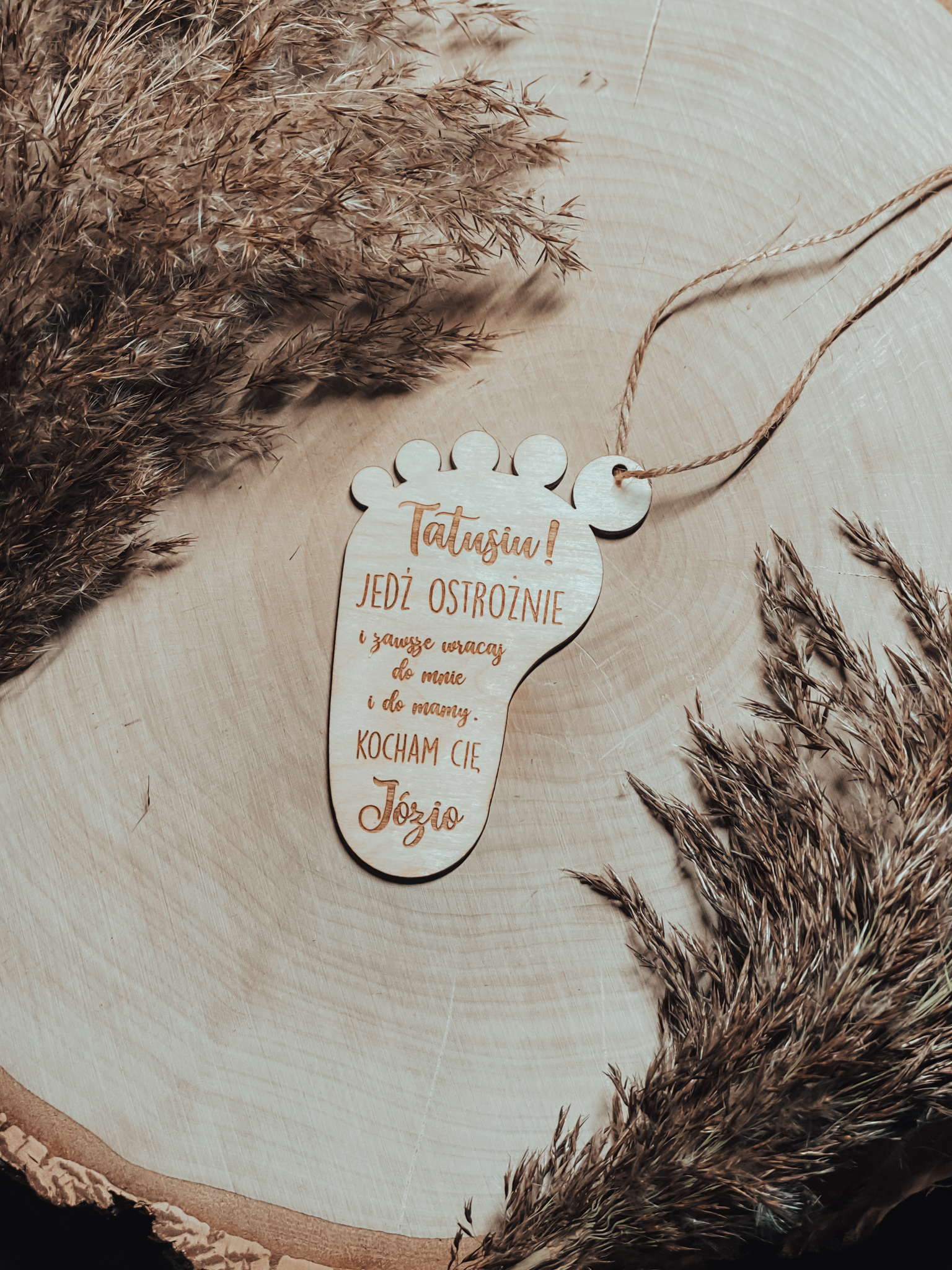 Drewniana zawieszka w formie stópki dziecka będzie świetnym prezentem dla każdego rodzica. Na dekoracji wygrawerowaliśmy tekst skierowany do taty z imieniem dziecka. Nasza zawieszka będzie świetną dekoracją, którą można zawiesić w samochodzie, w domu czy przy kluczach. Może być niespodzianką na Dzień Ojca bądź nawet bez okazji. Drewnianą dekoracje wykonaliśmy z 3mm sklejki oraz pomalowaliśmy ręcznie oryginalnym olejem do drewna w kolorze naturalnym. Kolor i faktura drewna może się lekko różnić od tego co widzimy na zdjęciach. W przypadku personalizacji, czyli swojego indywidualnego napisu proszę wpisać treść w polu "Twój tekst".