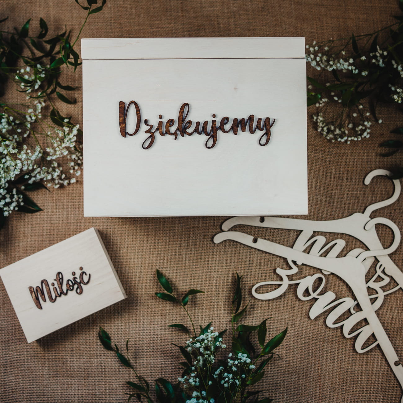 Drewniane pudełka na obrączki i koperty wraz z wieszakami to komplet który musisz posiadać. Będzie świetnie wyglądać podczas przygotowań, oraz zrobi wrażenie na gościach.