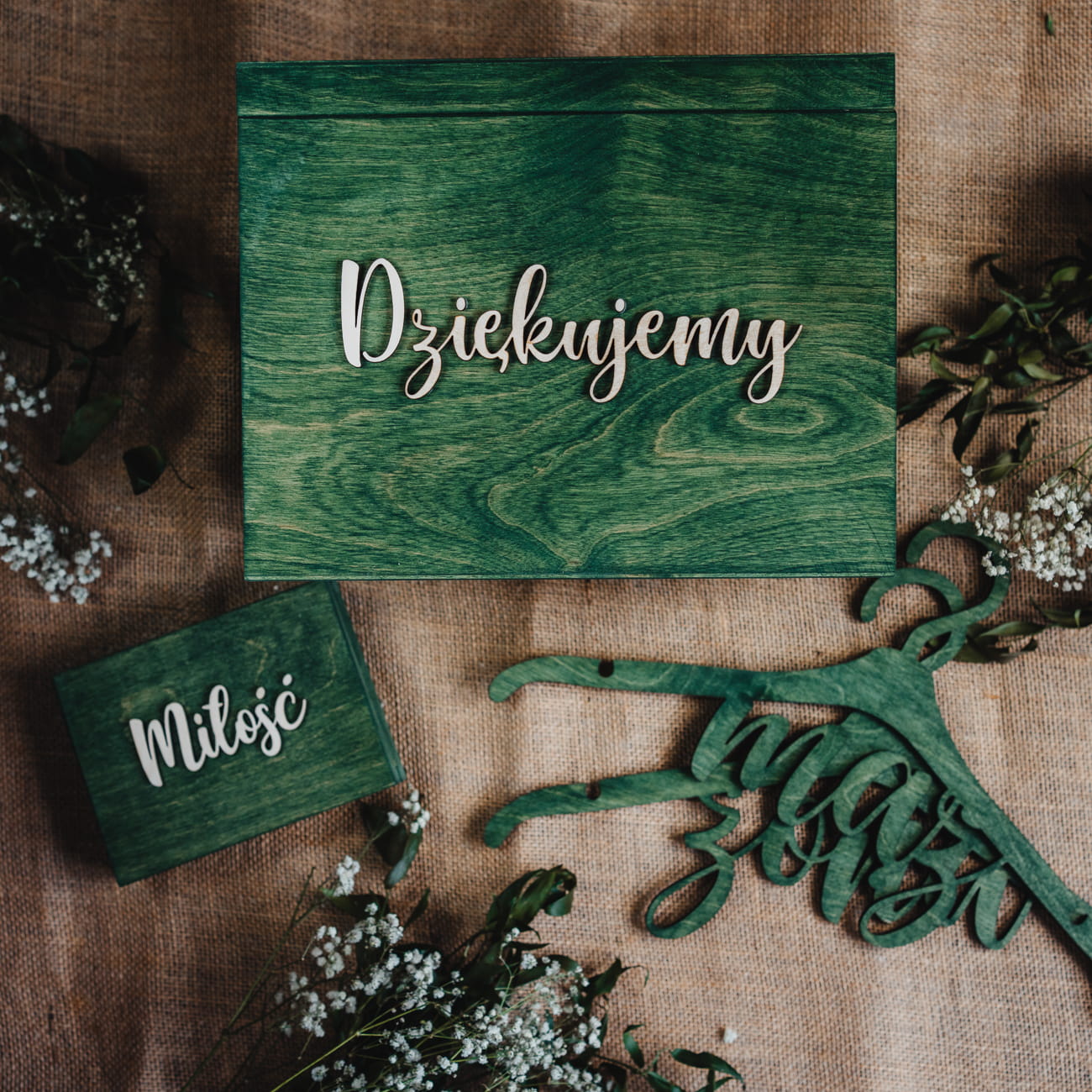 Drewniane pudełka na obrączki i koperty wraz z wieszakami to komplet który musisz posiadać. Będzie świetnie wyglądać podczas przygotowań, oraz zrobi wrażenie na gościach. Równie pięknie będzie prezentować się na fotografiach. Nasze produkty są wykonane z sosny, oraz sklejki. Malujemy je ręcznie oryginalnym olejem do drewna w kolorze zielonym. Wnętrze pudełka na obrączki wypełnione jest naturalnym mchem (chrobotek reniferowy) dzięki czemu pudełko prezentuje się niezwykle szykownie i elegancko. Kolor, faktura drewna i odcień mchu może różnić się lekko od tego co widzimy na zdjęciach.